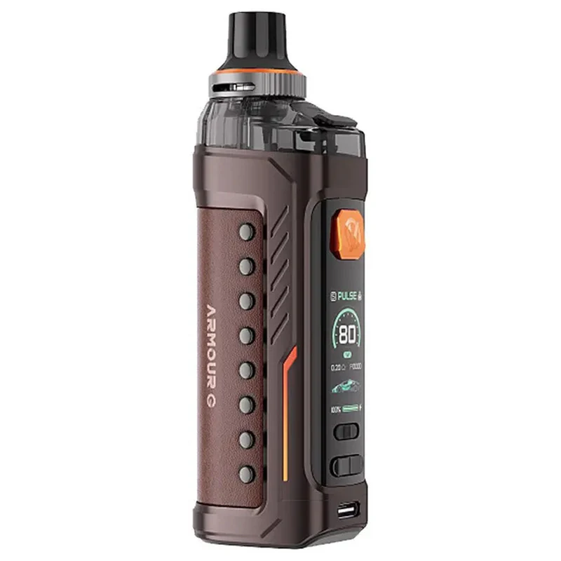 A wide wattage range of 5-80W allows for discreet mouth-to-lung drags or full-on cloud-chasing moments with just a simple twist of the dial. Additionally, specialised modes like Pulse and Eco provide options for enhancing flavour and extending battery life. Made with sturdy materials, the Armour G Pod Vape Kit is built to last, and the 2ml refillable pod makes refilling a breeze.